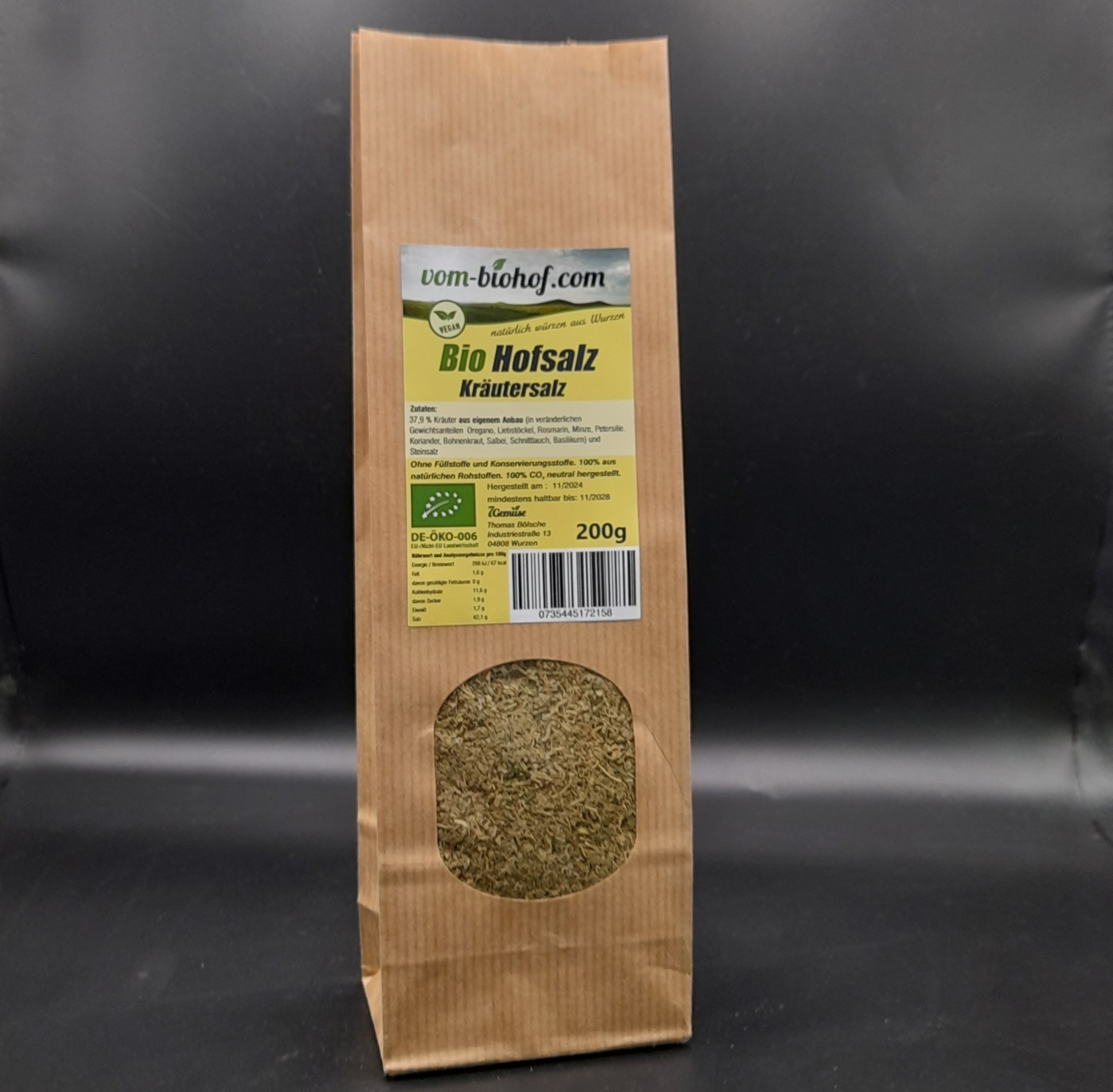 Die Komposition aus frisch geernteten Kräutern, schonend zerkleinert, gemischt mit dem gleichen Anteil Steinsalz, findet seine Reife in Tongefäßen. Anschließend trocknet die Mischung CO 2 neutral, mittels Lufttrocknung. Die Vermahlung erfolgt kurz vor dem Abfüllen in die Tüten, damit es sein volles Aroma behält. Die Essenz des frischen Kräutersaftes wird somit sofort vom Salz gebunden und bleibt Ihnen als Würzkraft erhalten. Unser Bio Kräutersalz erhält somit seinen unverwechselbaren, intensiven Geschmack.